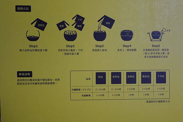 還有附上不同品項的退冰時間 像我是把湯包 食材包放在室溫下退冰