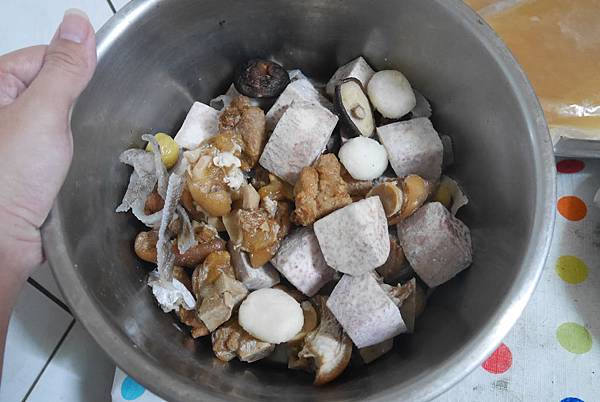 兩袋到出來滿滿的一小鍋 當季的芋頭 大塊的排骨 整顆的荸薺 豬腳等等配料