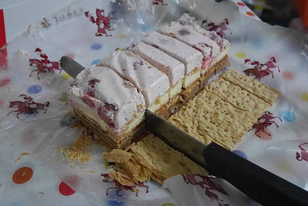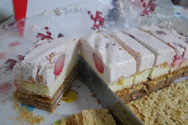 一樣請出我的西瓜刀來把拿破崙派切八段 可以看到草莓夾在其中