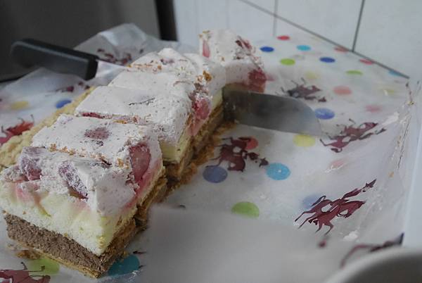 上頭是草莓醬調配的幕斯 夾上數顆草莓 數量不多 但每塊或多或少都還有草莓的蹤跡