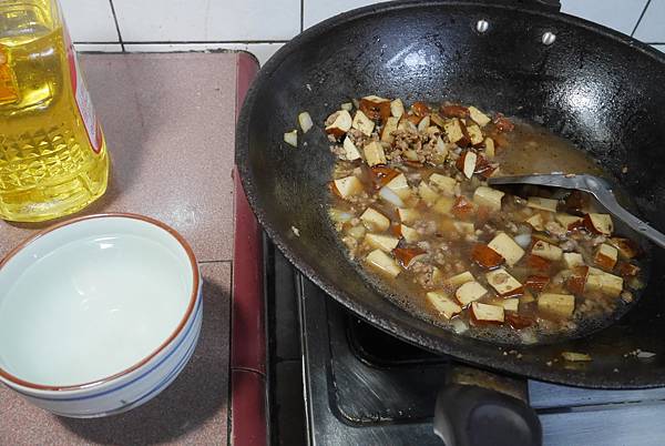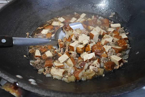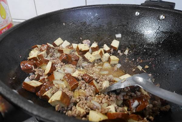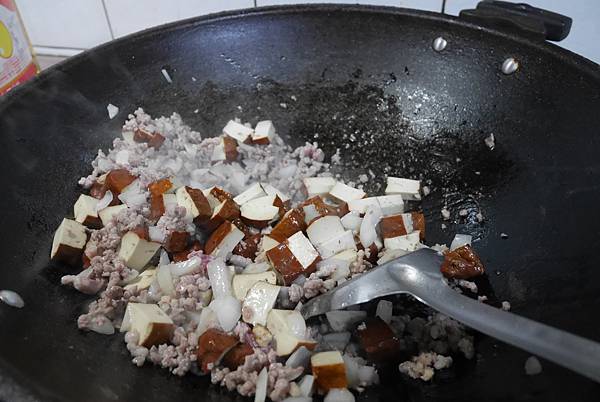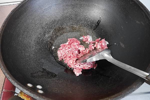 2. 熱鍋加油 比炒菜再多一點 因為絞肉偏瘦 豆乾也會吸油 先炒散絞肉出香氣 在往下一步驟