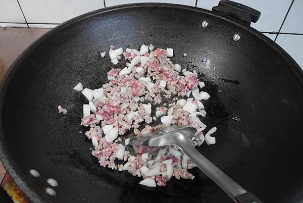 3.絞肉散了有香氣後 放入洋蔥炒香