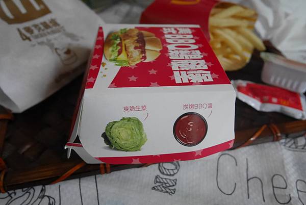 側邊也一樣有介紹裡面的食材 生菜跟少見的炭燒BBQ醬