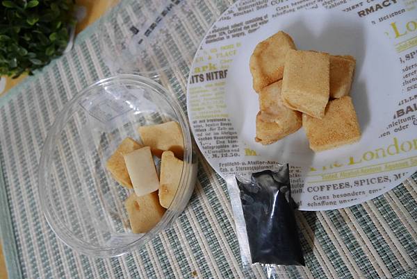 用塑膠片隔開,上層放了一包黑黑的醬料和小叉子方便使用