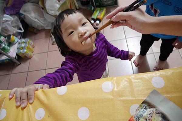 邊拌著米粉那香味引來兩位小調皮前來分食