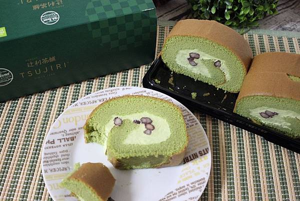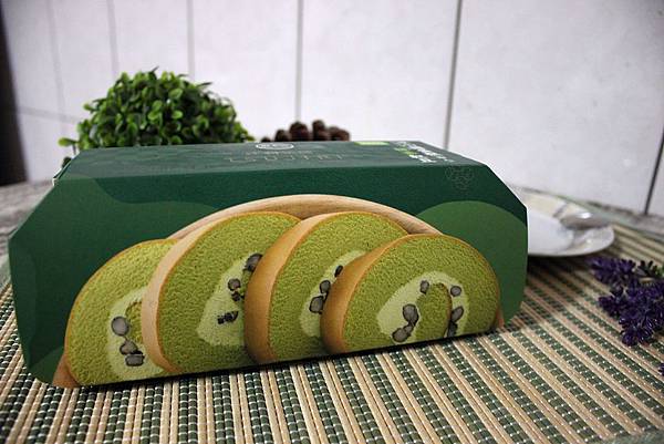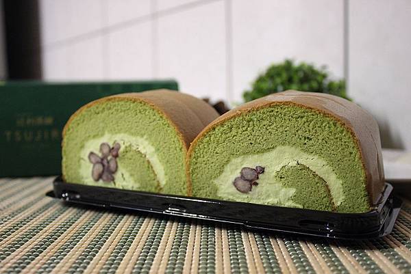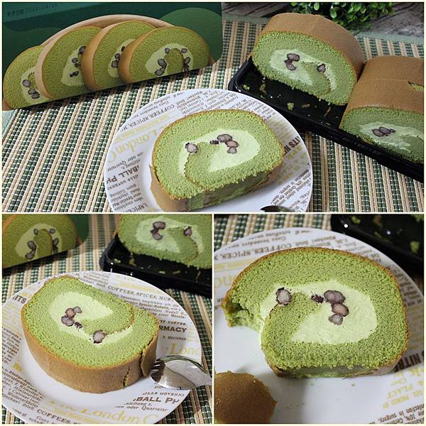 綠色的蛋糕體包裹抹茶鮮奶油跟紅豆