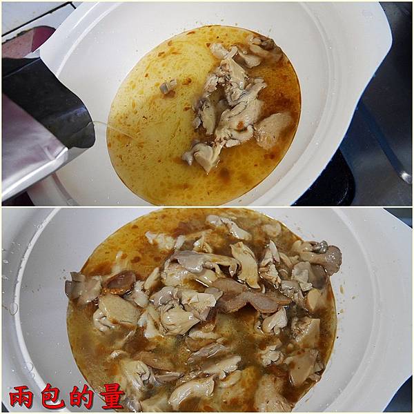 只要倒出調理包加熱,加入洗淨的菇菇們再煮熟就可以