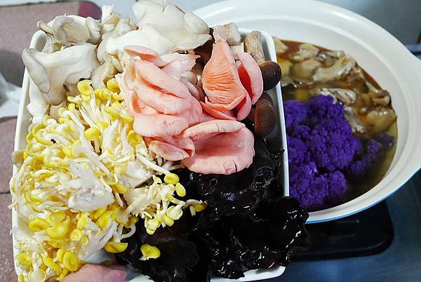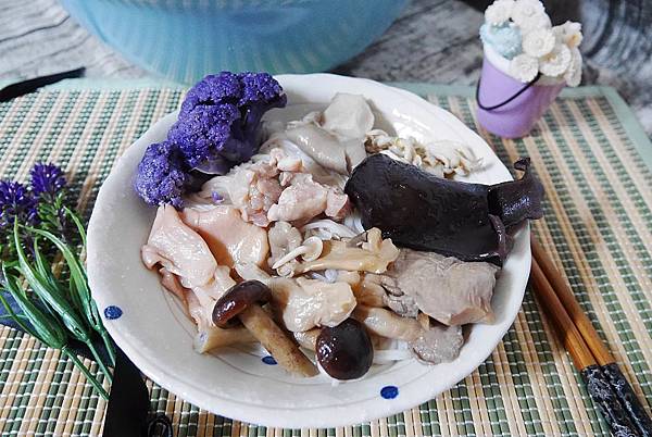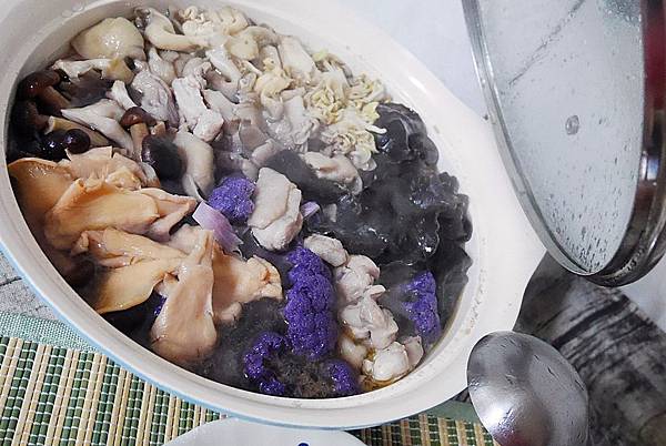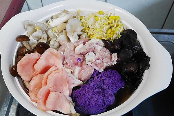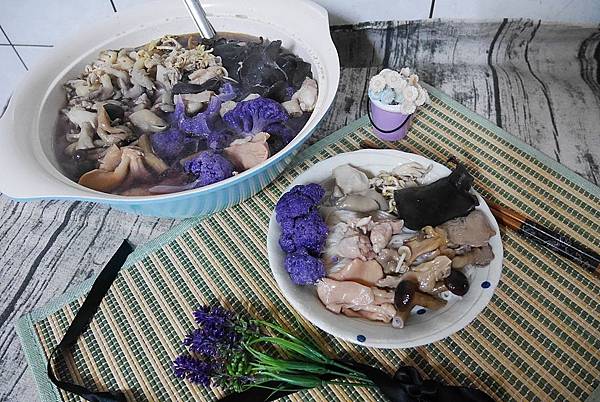 排好啦!!怕只有菇類太單調所以請出了紫色花椰菜跟雞腿肉來陪客