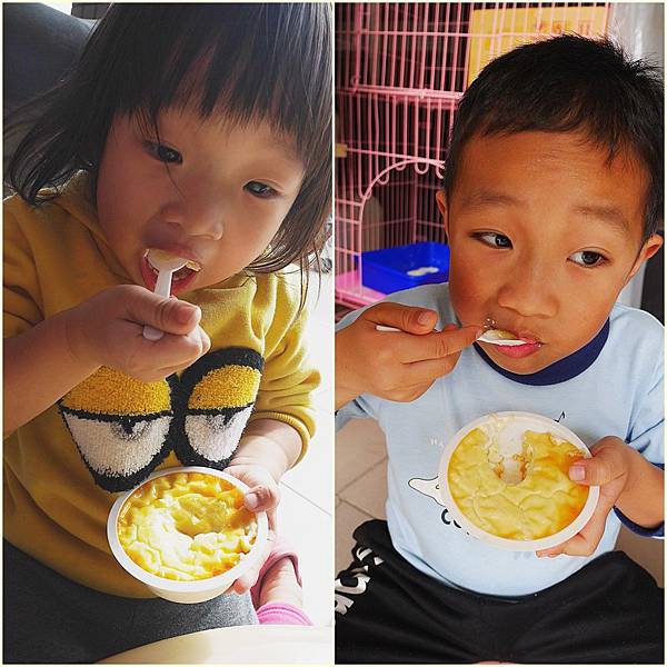 瞧他們吃得開心的咧~一口又一口的把布丁送到嘴裡