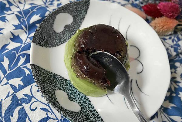 切開就可以看到濃稠的黑蜜,外層的抹茶粉因為多冰了一天有點潮濕