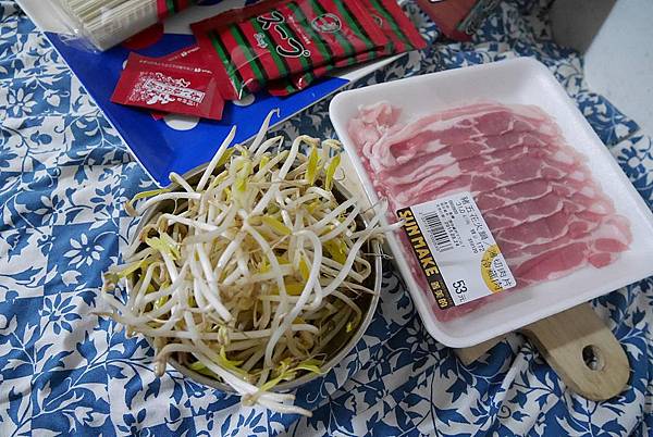 因為它沒有配菜所以自備豆芽菜跟五花肉片
