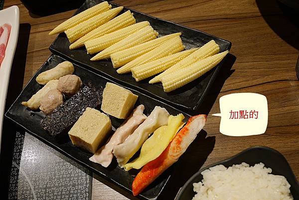 點一份玉米筍(60元)、火鍋拼盤(80元)、白飯(20元)