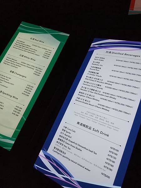 他的飲品從有酒精調酒、無酒精到香檳、白酒、紅酒到威士忌都有