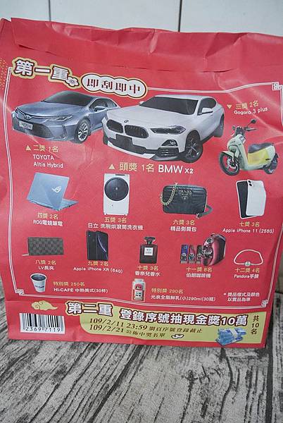 人家說的一袋在手希望無窮,他裡面的獎項最高就是BMW一台啦