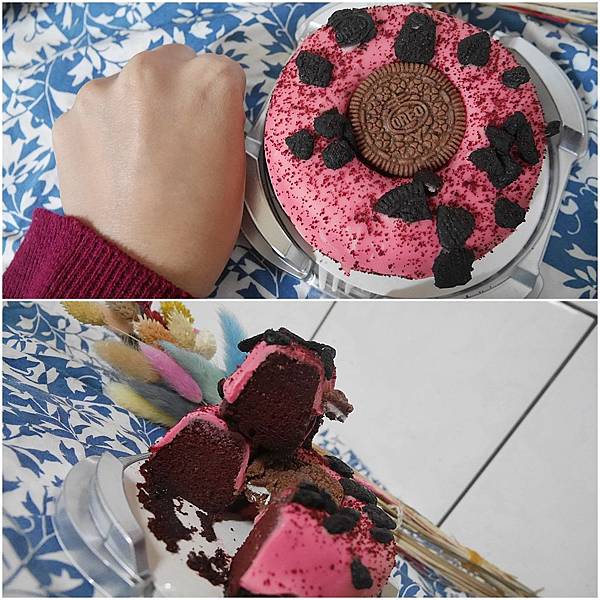 撒上點點的紅紅蛋糕體跟OREO餅乾碎片,有發現中間OREO顏色不一樣