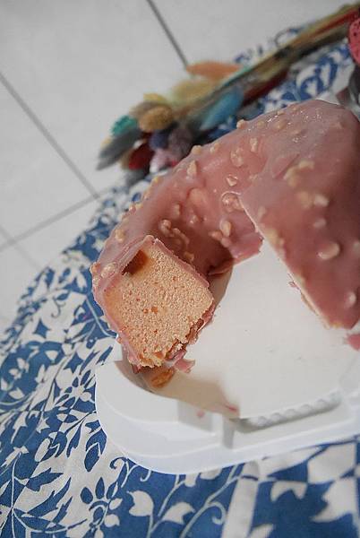 一切開可以看到裡面也是粉色的蛋糕體,外層的巧克力有點脆皮的感覺