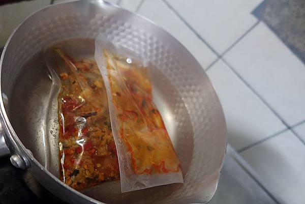 2.水煮加熱:準備一鍋水,取出產品連同透明袋放入鍋中蒸煮