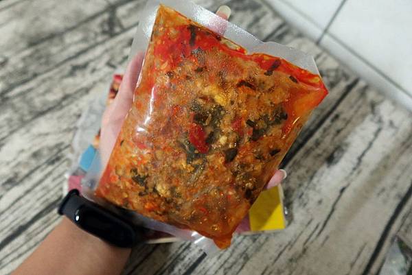 透明的袋子可以看到紅顏色的醬汁,想著那辣辣的滋味就塊流口水了
