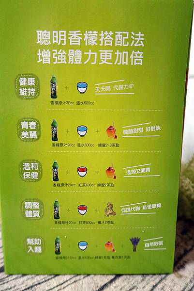 外盒側邊可以看到簡單的香檬汁搭配飲法
