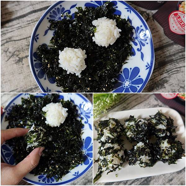 把飯捏成小團滾上一圈海苔酥搖身一變成為紫菜小飯糰