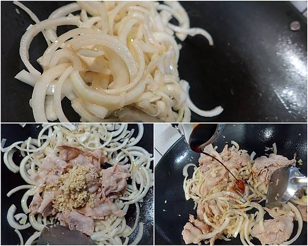 五花肉片 300G , 洋蔥 一顆 , 薑 一小塊 , 薑味醬油 2大匙