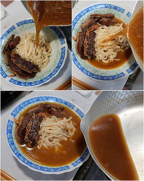 在把牛肉湯也倒入碗中,組合成好吃的牛肉麵