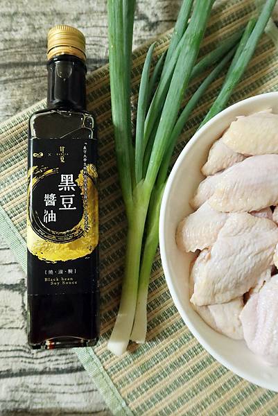 材料:二節雞翅 、甘夏手工釀黑豆醬油、蔥段