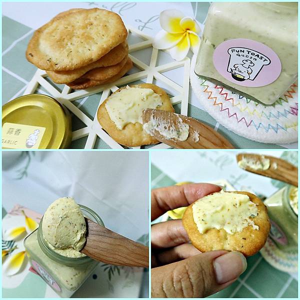 用蒜香奶酥沾上自己製做的香料小餅作搭配