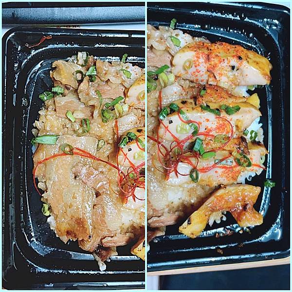 左邊是豬肉片搭配綠色蔥花,右邊是雞腿肉搭配辣椒粉跟辣椒絲