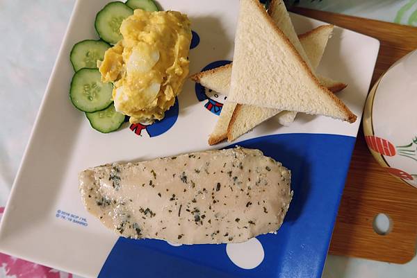 早餐一份雞胸肉加上吐司南瓜沙拉,營養滿分