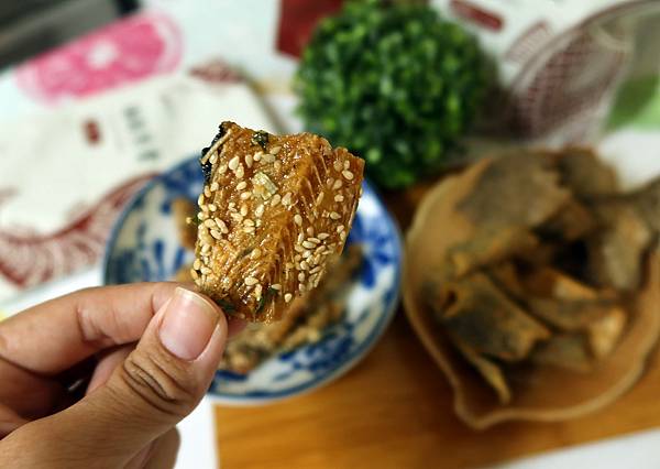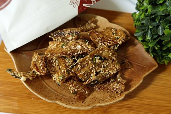 酥脆的魚骨咀嚼起來帶著麥芽糖甜甜的滋味,加上點點芝麻香跟些許青蔥味