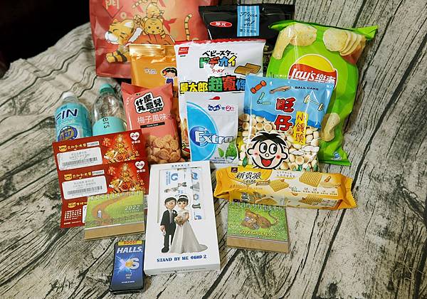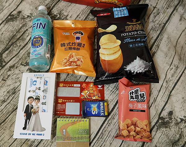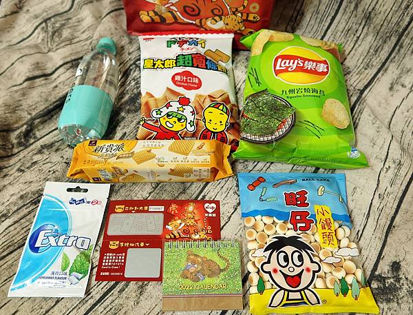 餅乾*4 、口香糖*1、氣泡水*1、小桌曆*1