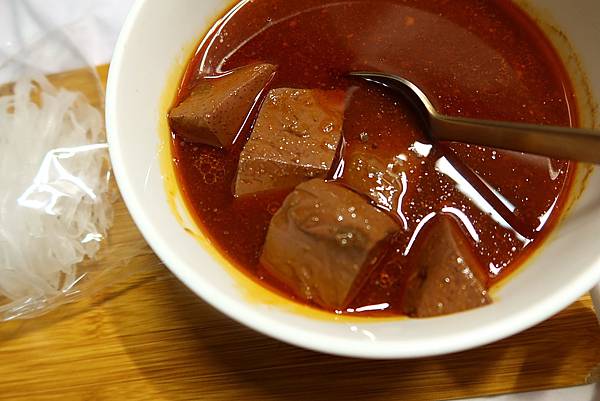 很多這類包裝的鴨血,因為浸泡久了加熱後鴨血吃起來雖然多汁但口味也偏鹹了