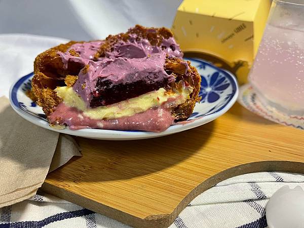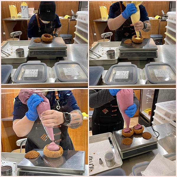 他外層的泡芙皮最底下是覆盆子餡 - 香草餡 - 莓果庫利 - 莓果餡
