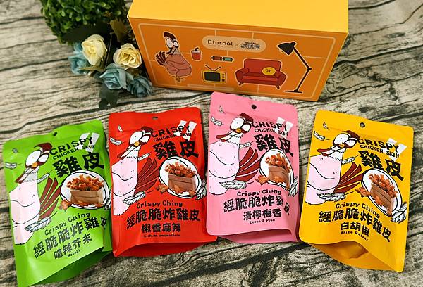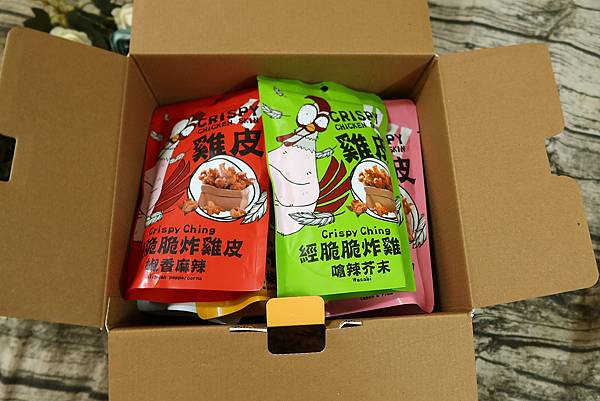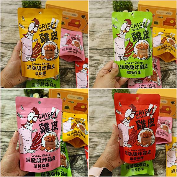 整箱裡有 經脆脆炸雞皮餅乾*4(白胡椒、椒香麻辣、嗆辣芥末跟清檸梅香各一)