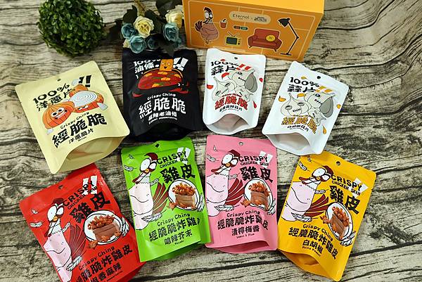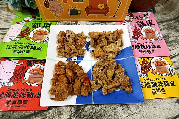 打頭陣的是炸雞皮餅乾,每一種口味都有不同的鮮明顏色
