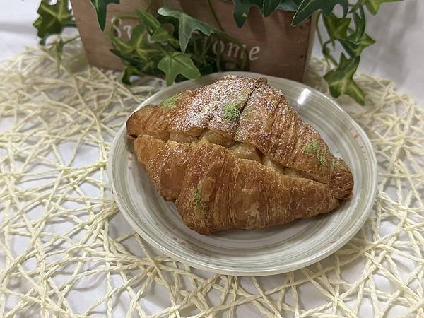 多層次的可頌切開放進蘋果餡,表面撒上白花花的糖粉跟綠顏色的檸檬粉(?)