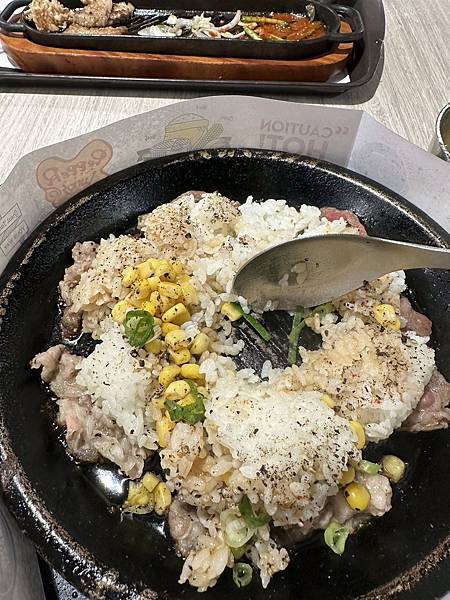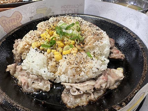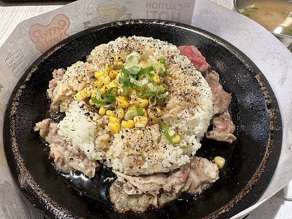 胡椒牛肉飯 - 熱騰騰的鐵板上只有白飯、牛肉片、玉米粒跟蔥花