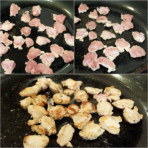 1.放入少量油後熱鍋,放入雞松阪,請注意雞松阪不要交疊到