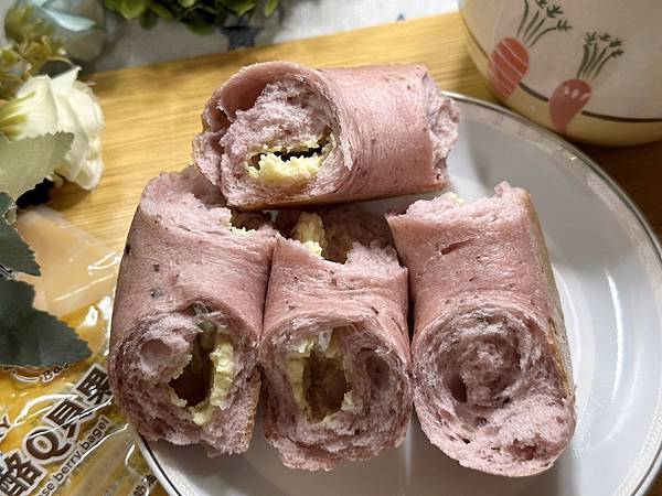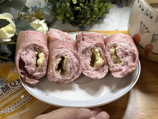 可以看到貝果麵糰間夾著玫瑰花醬的感覺,顏色其實蠻好看的