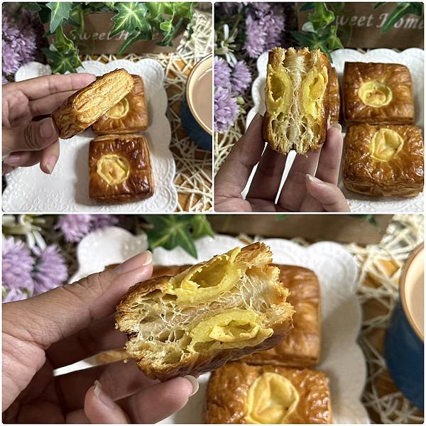 烤過後外層丹麥麵包體變的酥脆又有層次感