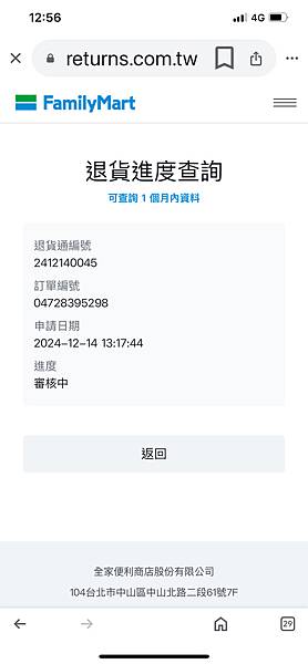 在12/14星期六申請因為是周末所以到12/17星期二才收到簡訊通知退貨編號