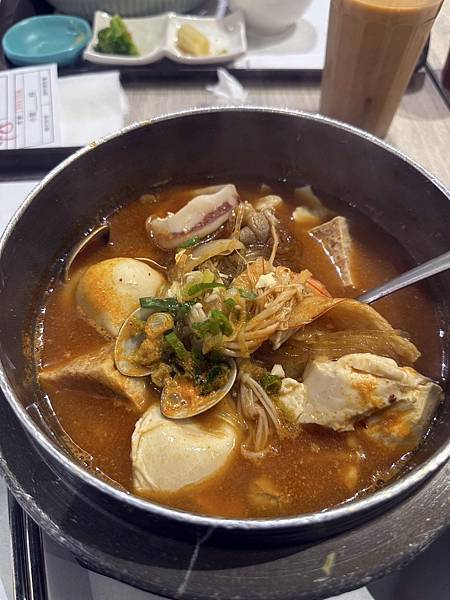 裡面有魷魚圈*2 、蛤蜊*3 、一隻蝦子、一片肉、一顆蛋跟少許冬粉跟丸子魚板