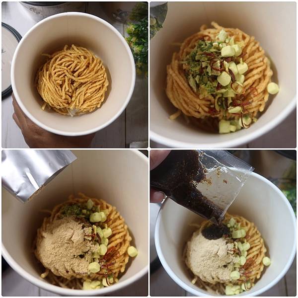 如果用沖泡的方式:加入粉包、材料包跟沙茶之後加入450ML沸水蓋上等2分鐘