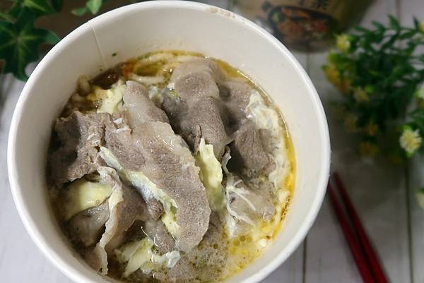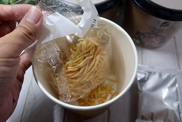 他的杯裝是很厚實的那種紙碗,比起一般的杯麵更有質感跟厚度